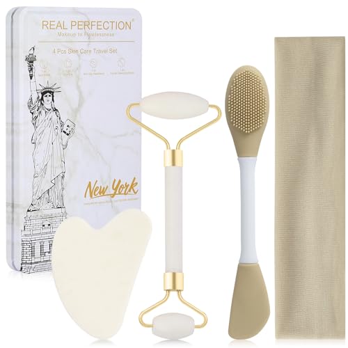 Real perfection gua sha facial tools face roller for wrinkles jade roller and gua sha set, scrubber pore brush headband skin care tools for travel skincare routine massaging reducing puffiness - white